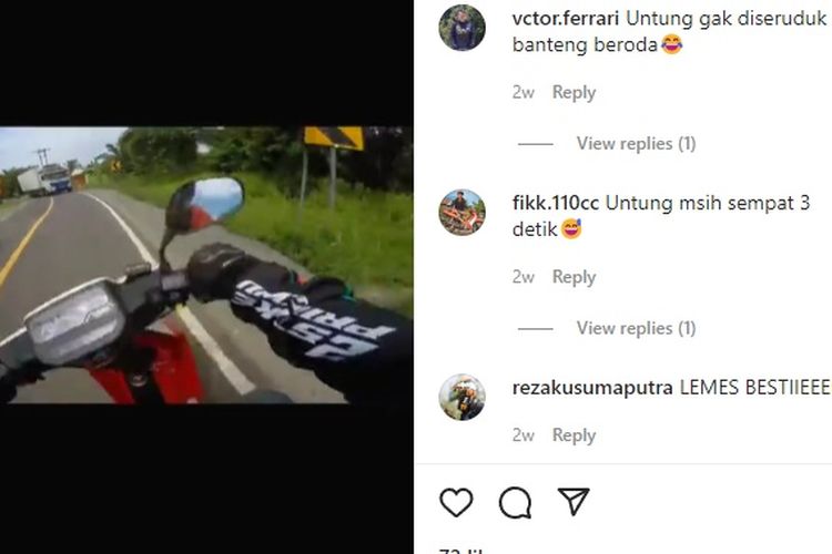 Pengendara Yamaha F1ZR sempat coba kejar Yamaha RX-King di jalan. Eh malah doi hampir saja diseruduk sama truk tronton yang lewat dari arah lawan.