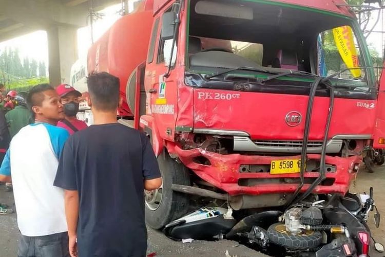 Diduga truk tangki Pertamina mengalami rem blong sehingga menabrak kendaraan di depannya dan menewaskan 8 orang.
