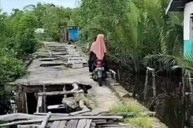 Sebuah jembatan di Indragiri Hilir, Riau mengharuskan pengendara senam jantung, salah lewat bisa langsung tercebur.