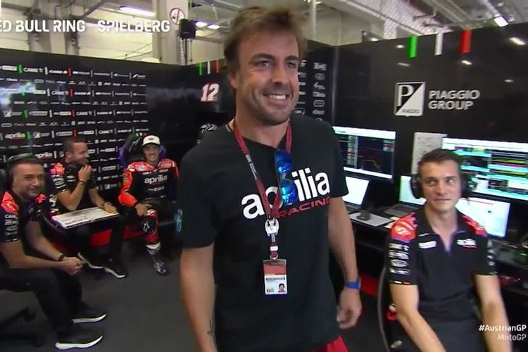 Juara dunia F1 Fernando Alonso hadir di garasi tim Aprilia pada MotoGP Austria 2022. Selain memberi dukungan ke pembalapm juga menemani pacarnya.