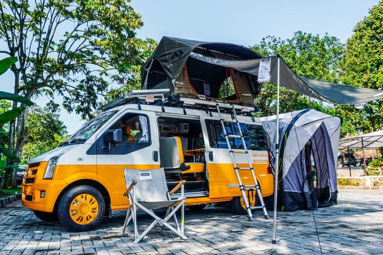 Modifikasi DFSK Gelora campervan pakai sofa bed kotak-kotak bikin nyaman anak-anak. TIdur di kabin bisa, di tenda juga bisa.