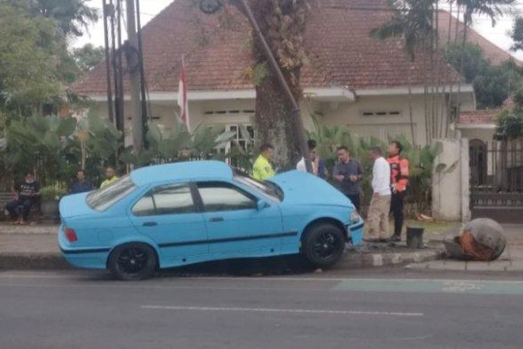 BMW 318i E36 alami kecelakaan tunggal di Kota Malang, Jawa Timur (Jatim) gara-gara salah satu bannya tergelincir hingga menabrak tiang listrik.