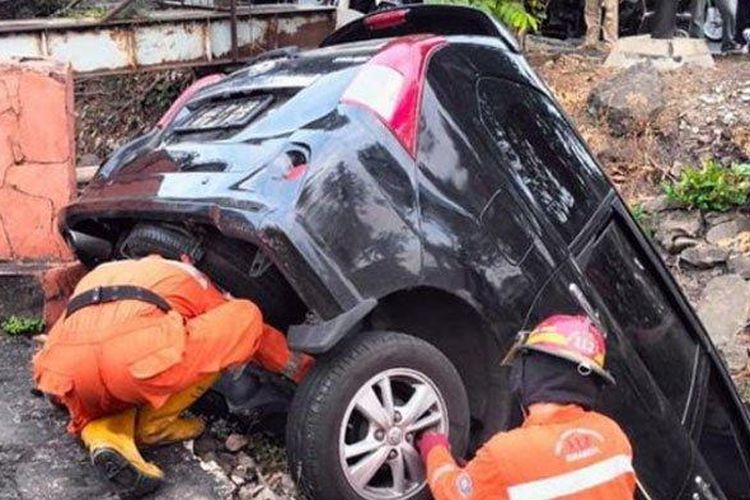 Sebuah Toyota Avanza bernomor polisi P-1725-AO nyungsep ke selokan hingga bumper depannya berlumuran lumpur.
