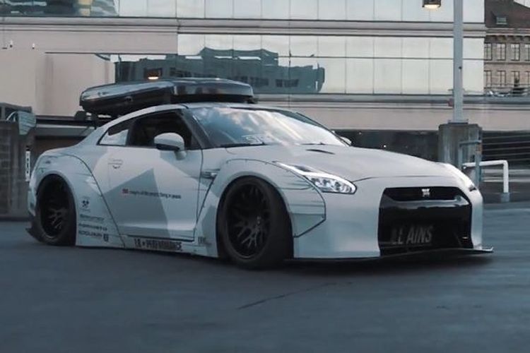 Modifikasi Nissan GT-R ini sukses tampil sangar dan stylish berkat asupan wide body gambot Liberty Walk, plus pasang roof box di atap.