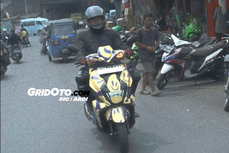 Sebuah motor dengan kamuflase icon smile tertangkap kamera netizen di Jakarta Timur. Foto skutik berbodi besar ini dikirim oleh Ardi.