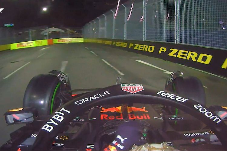Juara dunia F1 2021 Max Verstappen sempat tergelincir di tikungan 7 sirkuit Marina Bay saat menuju grid start F1 Singapura 2022.