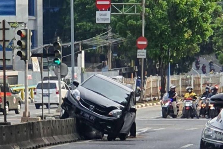 Sebuah mobil Honda Brio tersangkut di separator Busway di jalan Pejaten Village, Jakarta Selatan, Sabtu (15/10/2022)..