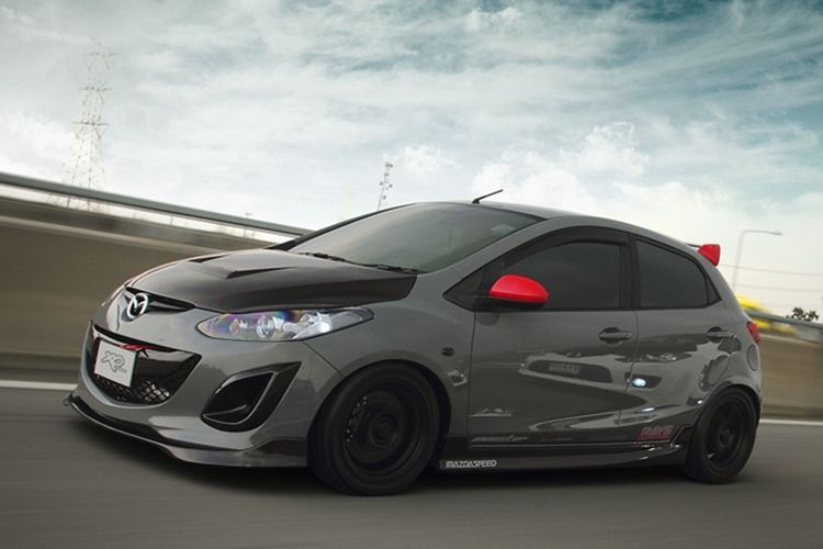 Modifikasi Mazda2 lama asal Thailand ini tampil agresif bergaya street racing dan pas diberi julukan Mazda Evil Track.
