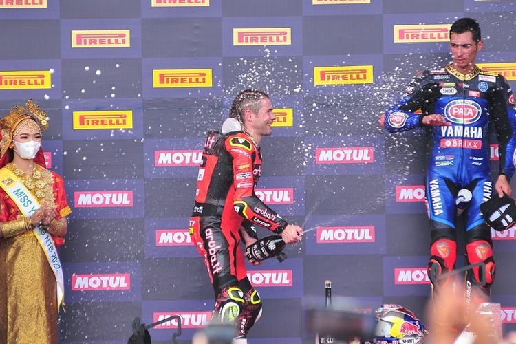 Toprak Razgatlioglu murka gara-gara disemprot sampanye oleh Alvaro Bautista di podium Race 1 World Superbike Mandalika 2022.