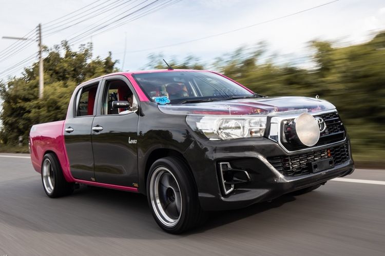 Modifikasi Toyota Hilux asal Thailand ini dandan racing dengan kombinasi part serat karbon dan kelir pink yang mencolok