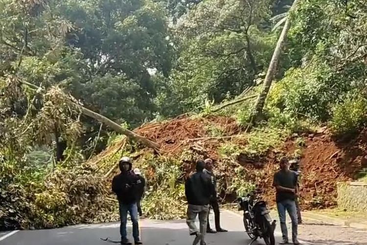 Sebanyak lima kendaraan dilaporkan tertimbun tanah longsor di jalur Puncak wilayah Cigeunang, Cianjur, Senin (21/11/2022). Evakuasi sedang dilakukan.