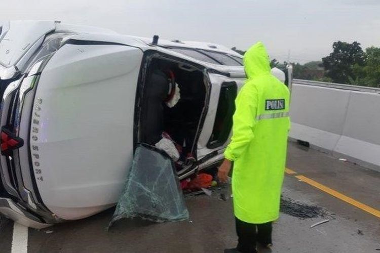 Sebuah Mitsubishi Pajero Sport terpelanting beberapa kali usai hantam pembatas di Tol Ngawi-Kertosono pada Minggu (27/11).