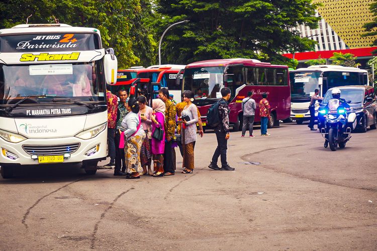 Sempat terjadi penumpukan tamu undangan ngunduh mantu Kaesang dan Erina di Stadion Manahan, Minggu (11/12/2022). Memang sedia berapa unit bus sih?