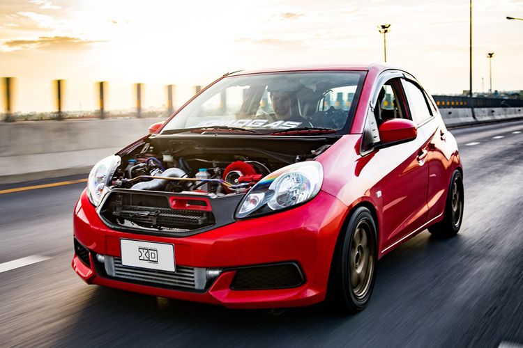 Modifikasi Honda Brio merah asal Thailand ini tampil terbuka bergaya street racing ekspos jeroan mesin rotaty copotan Mazda RX-7. Simak ulasannya