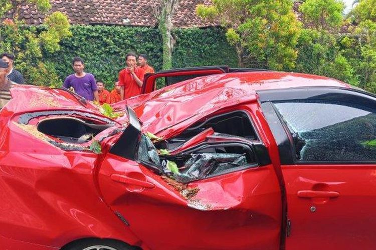 Sebuah Toyota Calya yang ditumpangi wisatawan asal Kebumen ringsek tertimpa pohon di Jalan Parangtritis, Yogyakarta.
