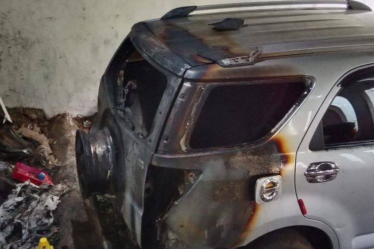Sebuah Daihatsu Terios yang terparkir di dalam garasi rumah tiba-tiba dilalap si jago merah, ledakan jadi tanda kebakaran.