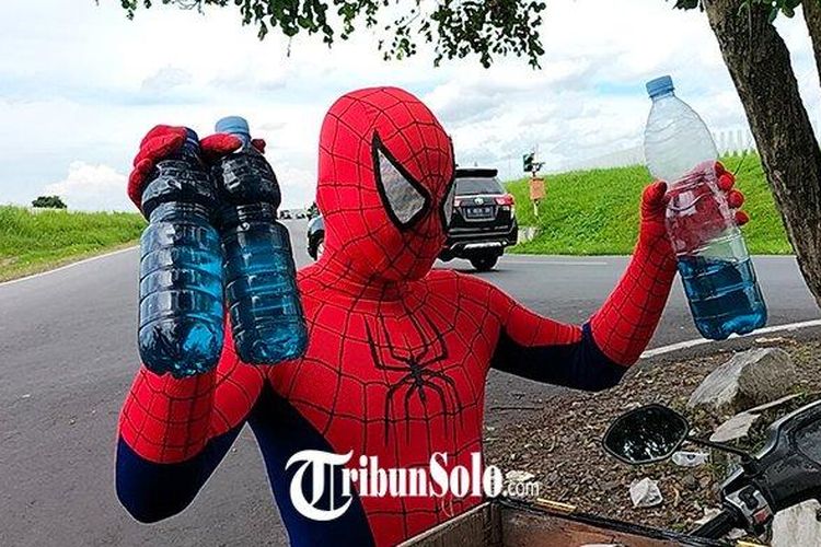 Seorang pria yang mengenakan kostum Spider-Man siap menolong pengendara yang kehabisan BBM di daerah Solo Raya.