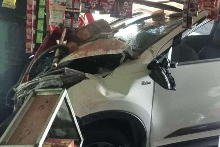 Sebuah Toyota Rush tiba-tiba seruduk pom mini dan warung kelontong setelah pengemudi mimisan di Jalan Raya Ciparay.