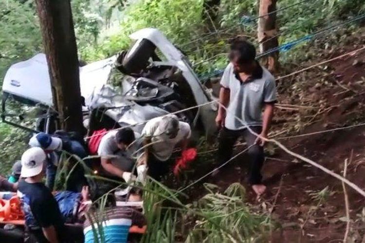 Toyota Avanza dilaporkan terjun ke jurang di Jalur Cangar-Pacet, Sabtu (14/01/2023). Rem blong jadi biang kerok insidennya.