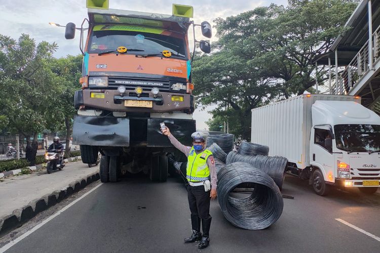 Truk muatan kabel jumping di Jalan Daan mogot, arus lalu lintas yang tersendat akhirnya bisa kembali normal