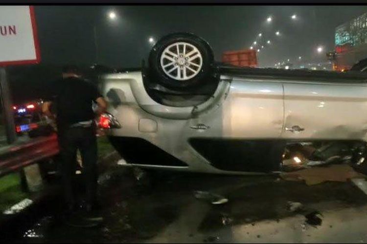 Rombongan kades asal Pamekasan yang ditumpangi Toyota Fortuner dari Jakarta terbalik di Tol Waru Sidoarjo, Jawa Timur (Jatim).