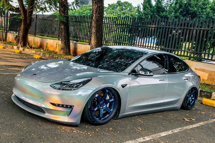 Tesla Model 3, mobil listrik yang tampilannya kandas maksimal pakai air suspension plus pelek sporty Volkracing TE37