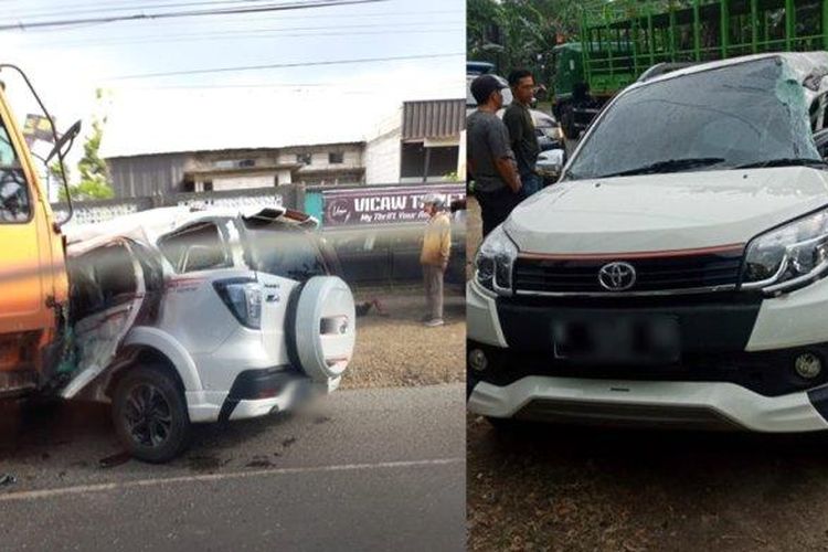 Gagal menyalip kendaraan didepannya, sebuah Toyota Rush diseruduk truk trailer dari lawan arah di Jalan Raya Pati-Kudus.