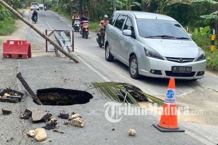 Lubang dengan diameter cukup besar muncul di Jalan Provinsi daerah Sampang, tepatnya di Jalan Raya Sampang-Ketapang.