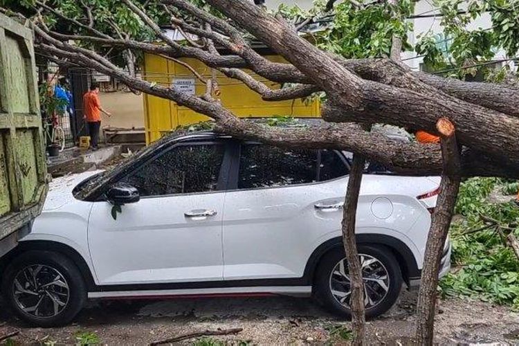 Hujan badai yang terjadi di kawasan Sunter Agung menyebabkan Hyundai Creta Prime tertimpa pohon angsana pada Minggu (05/02/2023).