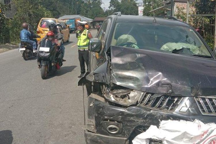 Sebuah Mitsubishi Pajero Sport dan Daihatsu Xenia terlibat adu banteng di Deli Serdang, Sumatera Utara, Minggu (19/02/2023).
