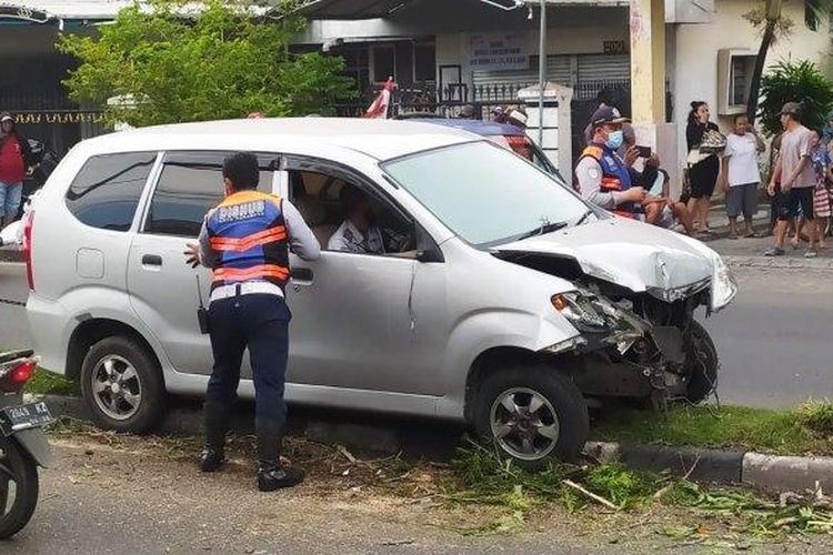 Sebuah Daihatsu Xenia menabrak sebuah pohon setelah dipepet Toyota Avanza di Jalan Raya Gunungsari, Wonokromo, Surabaya, Jumat (17/03/2023).