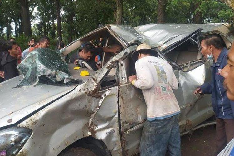 Sebuah Toyota Kijang Innova ringsek usai menabrak pohon di tepi Jalan Raya Ponorogo-Pulung Jawa Timur, Minggu (02/04/2023).