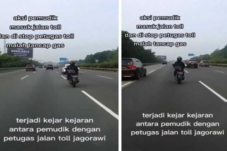 Beredar video viral yang memperlihatkan seorang pengendara motor nekat masuk Tol Jagorawi sambil dikejar petugas jalan tol.