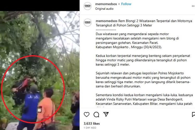 Beredar video yang memperlihatkan motor wisatawan di Mojokerto nyangkut di sebuah pohon, ternyata habis mengalami rem blong.