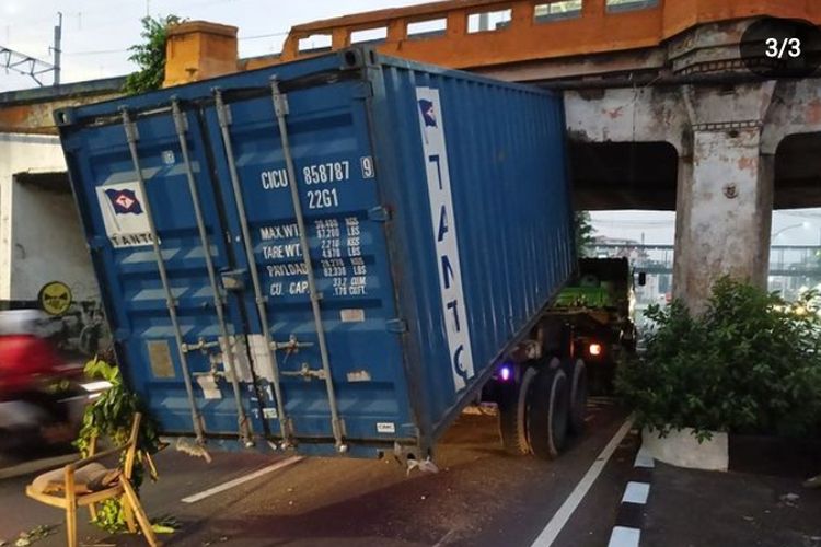 Truk Kontainer 'Nyangkut' di Kolong Jembatan Rel Matraman Jaktim