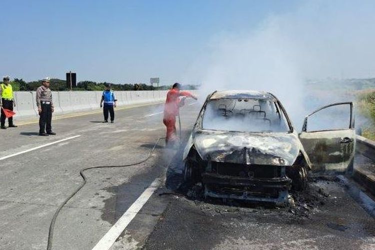 Satu unit Mitsubishi Grandis yang dikemudikan pasutri asal Gresik, Jawa Timur, terbakar hingga gosong di Tol Surabaya-Mojokerto, Rabu (31/5/2023).