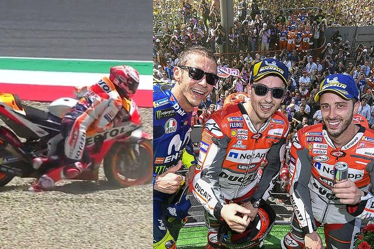 Marc Marquez punya pengalaman tak mengenakkan di MotoGP Italia 2018, disorakin penggemar Valentino Rossi usai crash.