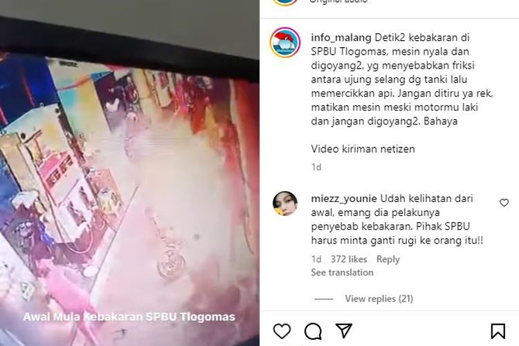 Beredar video yang memperlihatkan motor terbakar di SPBU, diduga karena menggoyangkan tangki dan menyalakan mesin saat isi bensin.