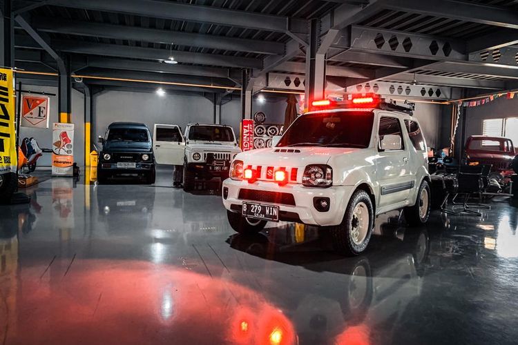 Modifikasi Suzuki Jimny JB43 pakai lampu dengan cahaya merah merona plus dilengkapi roofrack impor.