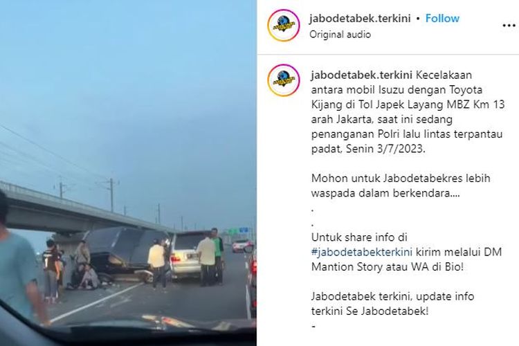 Kecelakaan terjadi di tol layang Japek MBZ KM 13 pada Senin (3/7/2023) antara Isuzu Panther dan Toyota Kijang, diduga gagal nyalip dari bahu jalan.