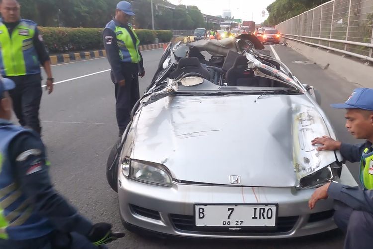 Kecelakaan terjadi menimpa Honda Estilo dengan Nomor Polisi B 1 7 RIO di Jalan Tol Priok arah Cawang, Kamis (6/7/2023)..