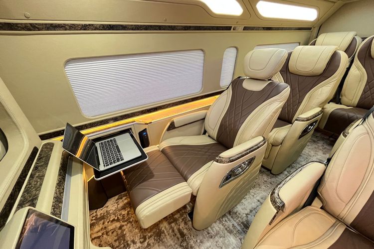 Imbangi jok elektrik di kabin, modifikasi Toyota HiAce Premio Prestige Series buatan Baze juga full fitur di interior.