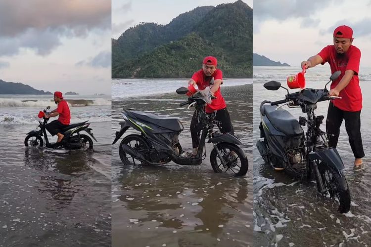 Enggak Takut Rangka eSAF Keropos, Selebgram Trenggalek Bikin Konten Honda BeAT Mandi Pakai Air Laut