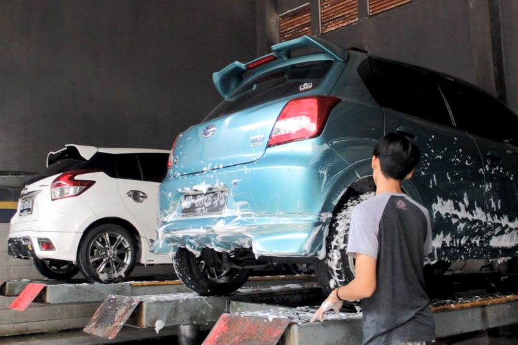 Sebaiknya cuci mobil di tempat teduh yang tertutup menghindari terik matahari langsung ke permukaan cat mobil.