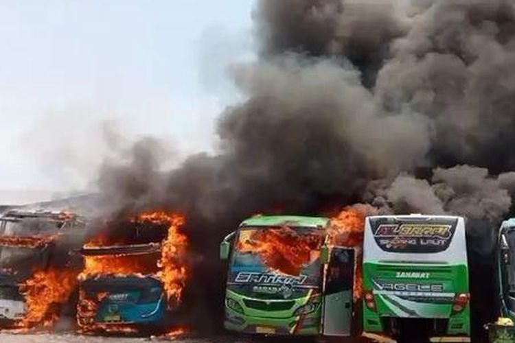 Kebakaran terjadi di garasi perusahaan otobus (PO) Sahabat, Rabu (18/10/2023). Dugaan sementara, api muncul dari sini.