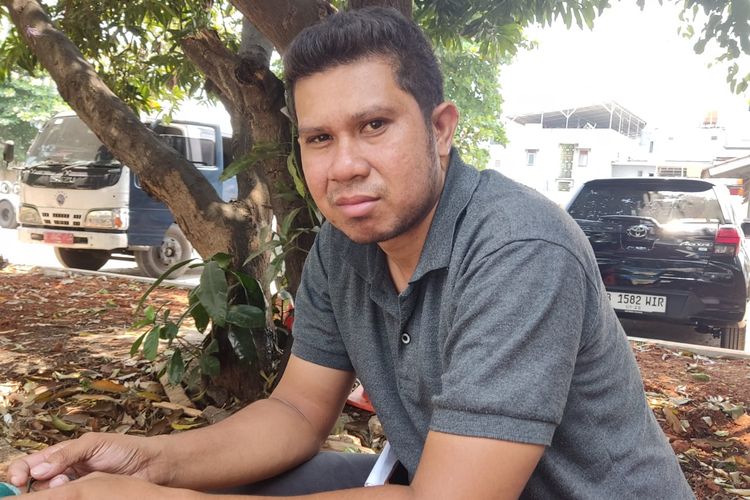 Andreas tertunduk lesu di bawah sebuah pohon di kantor Dinas Perhubungan, Jakarta Selatan, Senin siang ( 23/10).