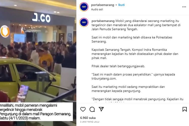 Satu unit Honda Brio menabrak pengunjung dan eskalator Mall Paragon Semarang pada Sabtu (4/11/2023) malam, diduga marketing tidak bisa mengemudi.
