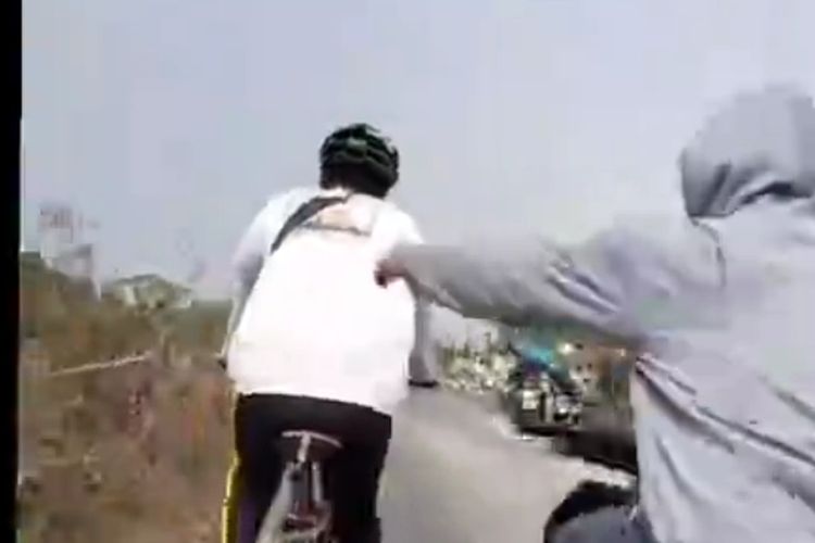 Seorang pesepeda terjatuh setelah tas selempangnya di jambret oleh pengendara motor di Kalimalang, Bekasi