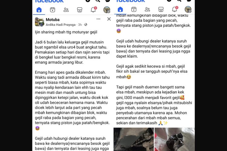 Akun bernama Ardika Hadi Prayoga yang mengaku pemilik Mitsubishi L300 mengalami masalah mesin jebol.