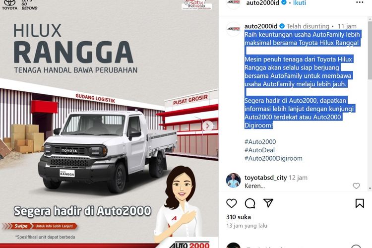Toyota Hilux Rangga telah resmi dijual di Indonesia. Terlihat dalam postingan akun Instagram @auto200id